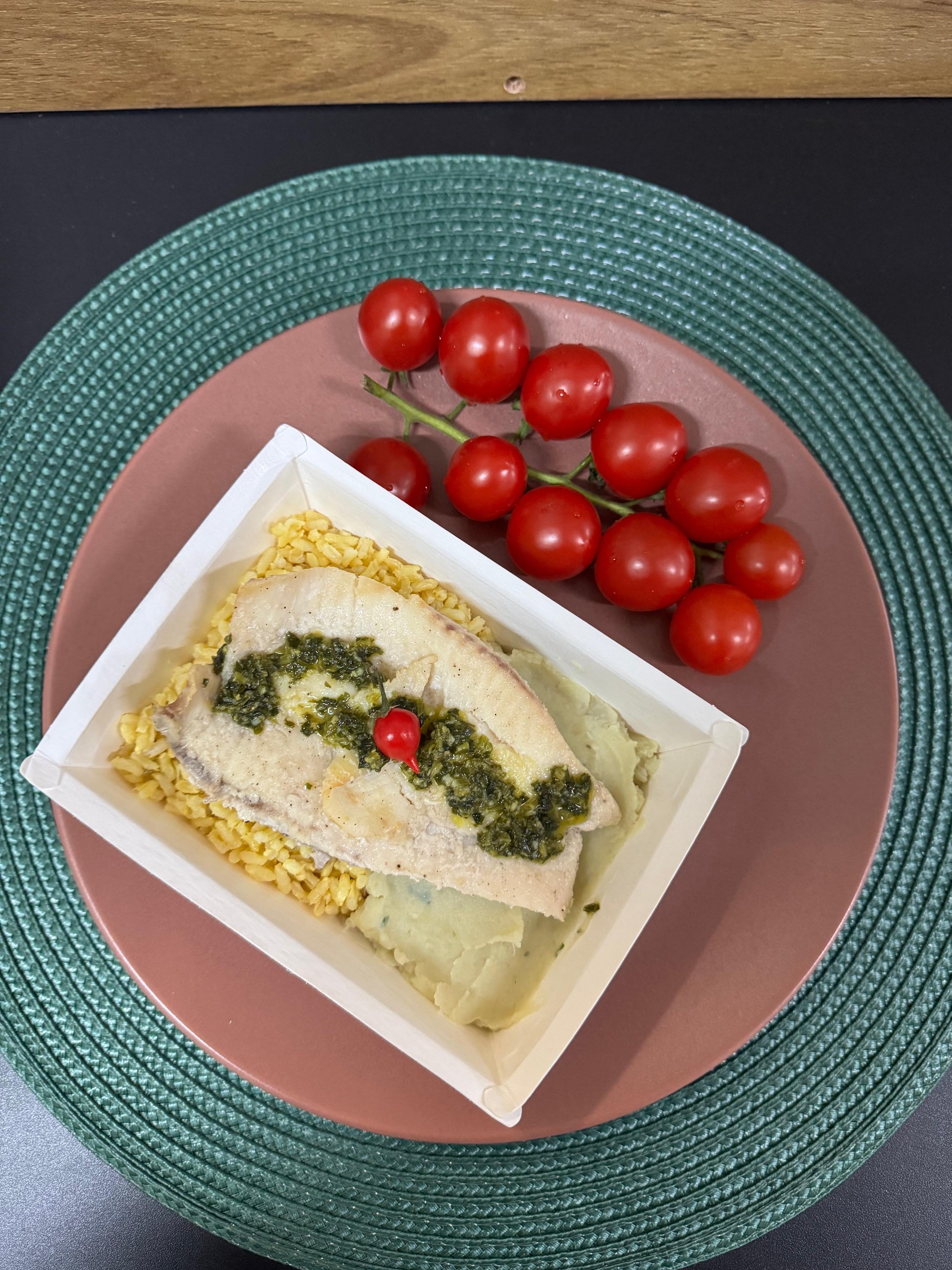Peixe Merluza assado com molho de ervas + arroz integral + purê de batata doce (porção de 100g)